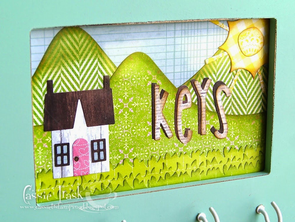 Oh was it fun! I used a bunch of Taylored Expressions goodies to make this, and I made it just in time! I used this Decorative Wood Frame from the TE store, and screwed some hooks right into it. As you can tell, I didn't use a single stamp, but I did use lots of TE dies and plenty of ink. Here is the list of TE dies that were used: Build a House , Build a Scene - Mountain Tops, Build a Scene - Sunshine, Grass Border, and Tall & Skinny Alpha. I also used various distress inks, and LOTS of designer papers from my stash to scraps. I'm overjoyed with how this turned out!
