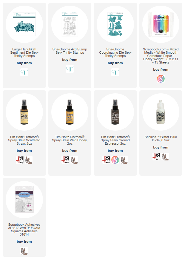 I really like big sentiment dies like this Hanukkah die from Trinity Stamps. You can make it the focal point or your card and then have fun making whatever background you want. I made mine using some Mixed Media paper and various Distress Inks. The little gold coins are from the Sha-Gnome set from Trinity Stamps. To finish off that large sentiment, I did add some Icicle Stickles to the bottom half of both words. It's such a beautiful look.